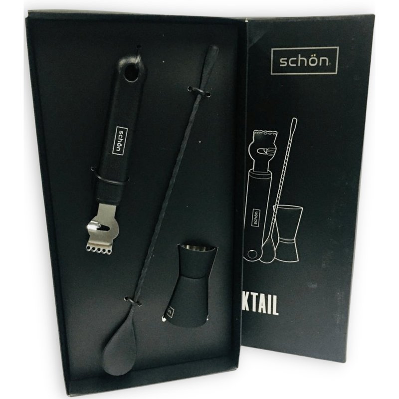 El Schön Set Negro Zester + Cuchara + Jigger C/Caja ofrece herramientas esenciales para preparar cócteles con precisión, en una presentación premium. Un regalo ideal o una incorporación elegante para cualquier barra.